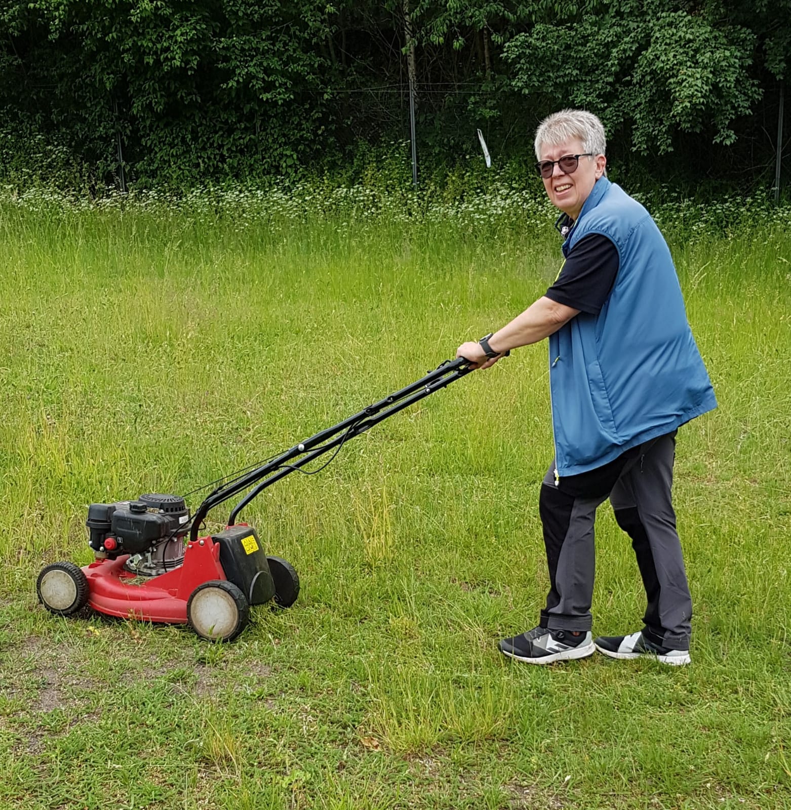 Mittlerweile war das Gras überall kniehoch, die Brombeeren rundherum prächtig gewachsen und die Zäune schön zugewuchert. Doch nun ist alles wieder schön: Gabi und Gudrun, Pit und Karin haben sich - natürlich nacheinander - aufgemacht und das gesamte Gelände gemäht. Auch die Brombeeren sind zurückgeschnitten, die Zäune wieder frei und es ist geharkt.