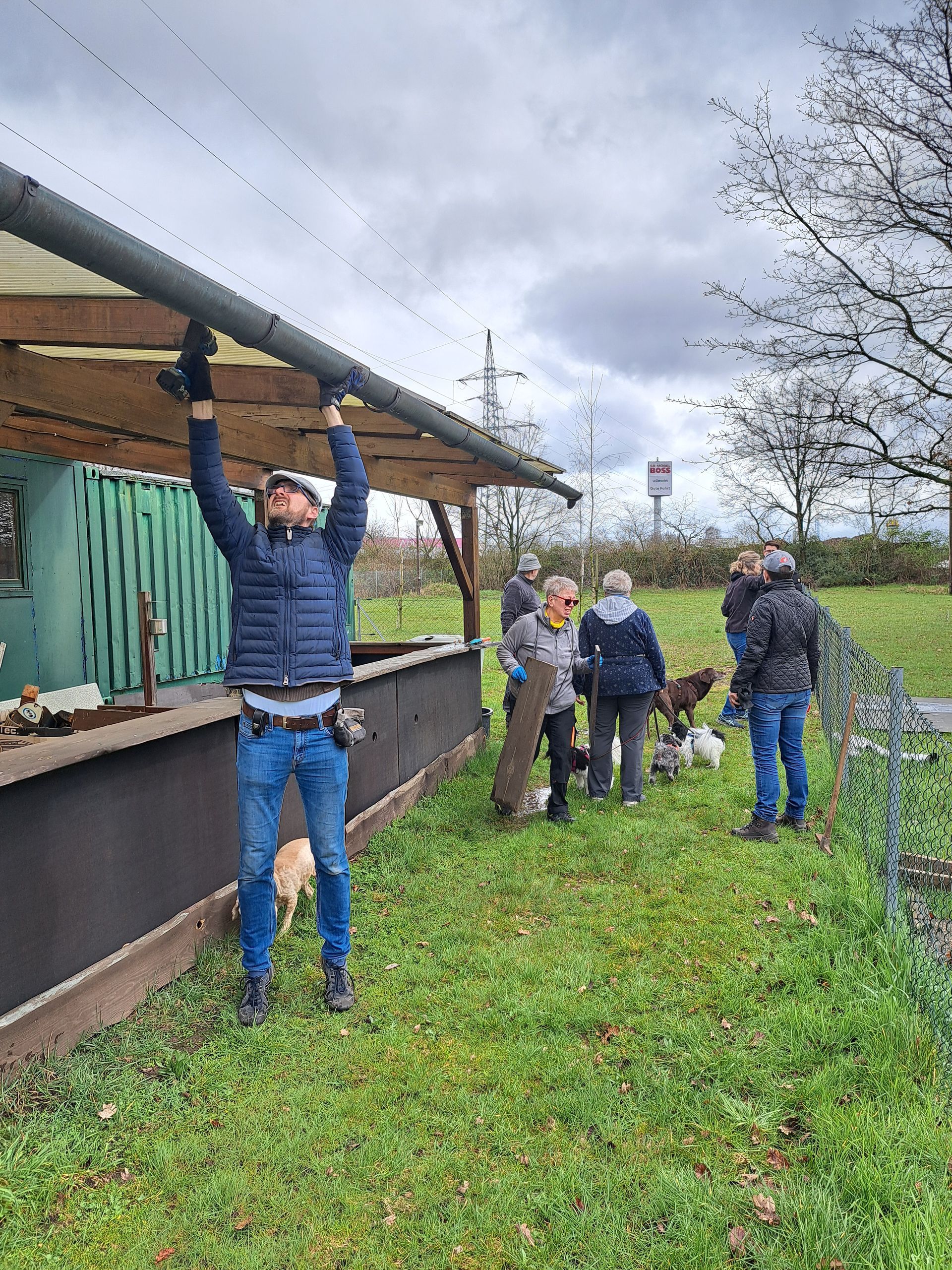 Der Wettergott war gnädig gestimmt und hat uns herbstkühles, aber trockenes Wetter beschert. Nachdem zunächst ein kompletter Bauwagen statt mit Pferdestärken von Menschenhand gedreht wurde, Platten nahezu perfekt gelegt und der Treppenzugang "gerichtet" wurde, konnte endlich "Dies und Das" aus dem Vereinsheim dorthin verbracht werden. Hierfür waren viele Menschen lange unterwegs und konnten so auch ohne Hunderunde Schritte sammeln! Der Sitzrasenmäher und Petra haben sich langsam aneinander gewöhnt und zogen dann routiniert ihre Bahnen, die "Plattenprofis" führten ihre Arbeiten munter an anderer Stelle weiter und manch einer wollte gar ganz hoch hinaus. Dank Gabi konnten wir uns mittags mit einem köstlichen 2. Frühstück stärken, bevor wir am Nachmittag müde, aber glücklich nach Hause fuhren. Nicht nur unser Trainingsplatz, sondern insbesondere auch unser Vereinsheim erstrahlt nun in neuem Glanz! Danke sehr an all die helfenden Hände und hoffentlich bis bald!